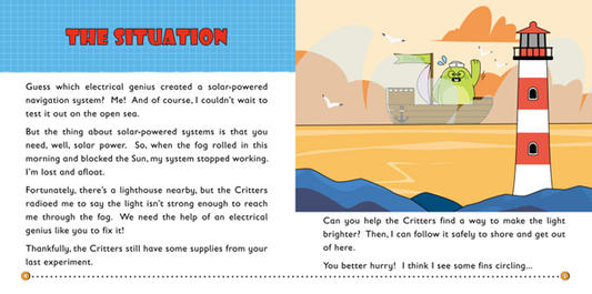 Electric Challenges is a ten-book series that turns bored young readers into hands-on engineers and the newest masters of electron flow. Our unlucky hero Spark constantly gets into trouble, and the reader figures out everything from circuit types to conducting materials to save the day. The clever open-ended challenges often have more than one right solution, and readers get to learn from their own and Spark's mistakes!