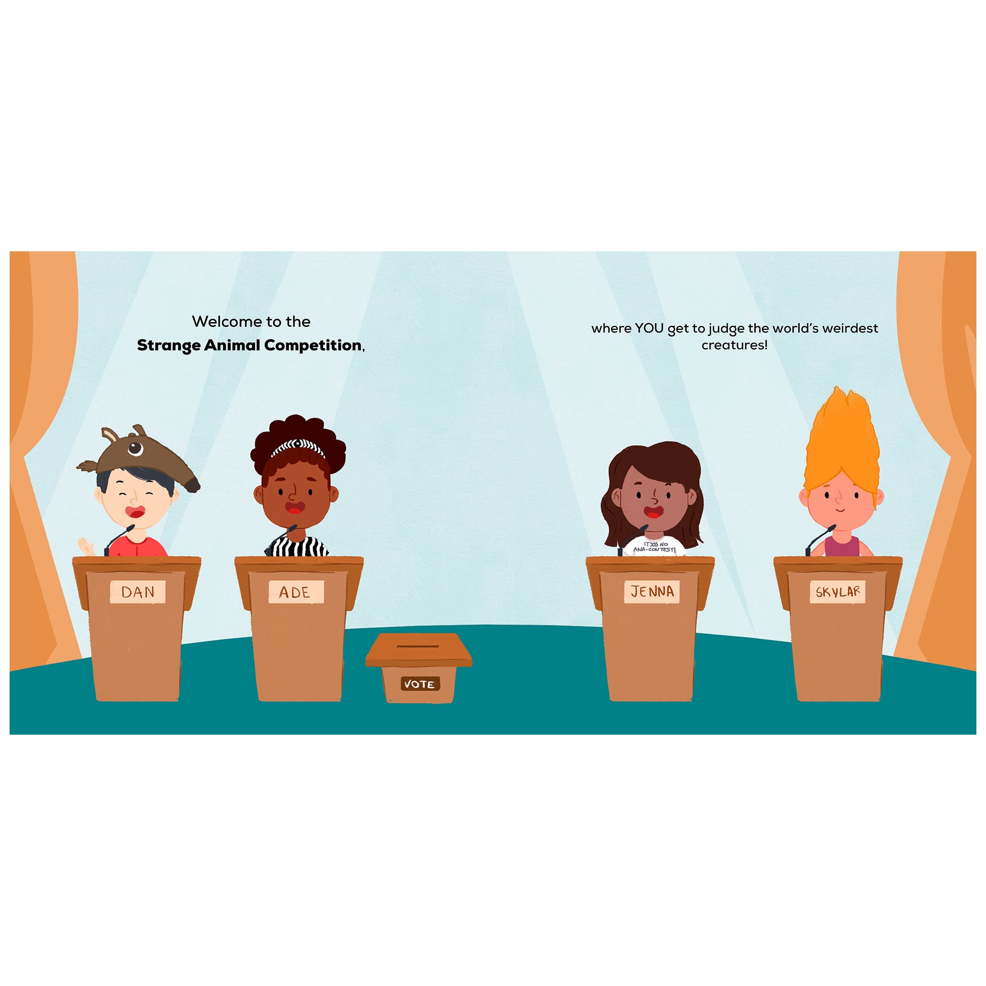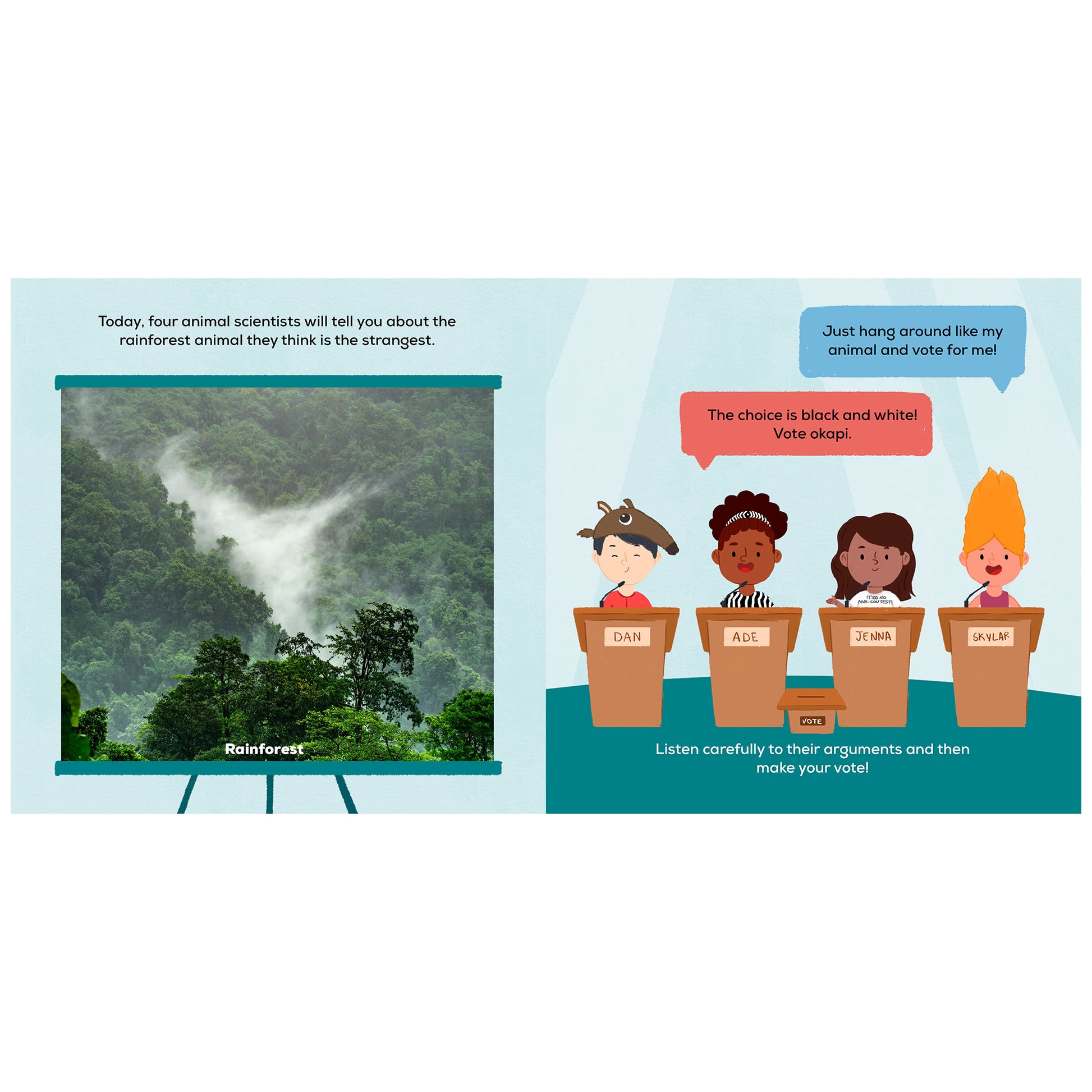 Put on your judging hat! Four young scientists want YOU to choose the strangest rainforest animal. Their creative arguments include long tongues, striped legs, and slow movers. Read carefully and cast your vote!